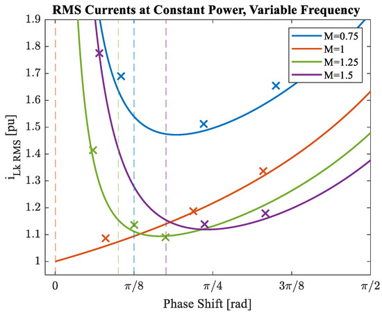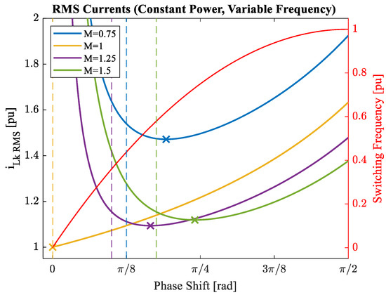 where is the switching frequency at the maximum phase shift for a constant power operation. The minimum is marked with an ‘x’ for each curve in their respective colors. The figure shows that for , the RMS current always increases with the phase shift, and the lowest value is at the lowest possible phase shift. However, for , the minimum current value happens at higher phase-shift angles.
