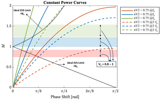 M vs phase shift constant power curves. Power curves are referred to values: 0.75 (red), 1 (blue) and 1.25 V (green). The colored areas represent the variation of from 0.8 to 1. Solid lines and dashed lines correspond to a switching frequency of and , respectively. The ideal ZVS limits are shown in black dotted lines.
