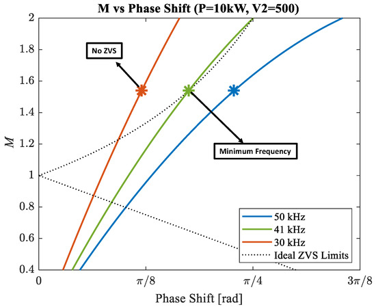When working at a certain power, the phase shift is a consequence of the given operating point, making it necessary to consider the switching frequency as a variable to modify the phase shift. This allows the power curve to move in any direction, making it possible to work at any given value of M without losing ZVS. According to the analysis presented in the previous subsection, it becomes necessary to define the minimum frequency needed to operate within the ZVS limits for any given operating point. From Figure 6, it is stated that higher frequencies are needed to move the power curves inside the ZVS limits. However, increasing the switching frequency too much may lead to higher conduction and switching losses. Therefore, it is beneficial to work at low phase-shift angles, close to the ZVS limits, where the RMS currents are low, as well as the switching frequency.