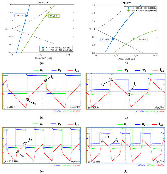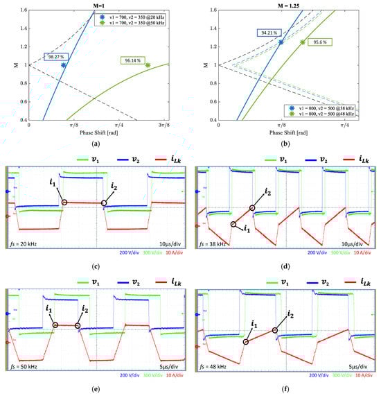 Converter operating at constant power and variable switching frequency at different operating points: (a) 20 kHz (blue) and 50 kHz (green); (b) 38 kHz (blue) and 48 kHz (green); (c,e) correspond to the operating point of (a) at 20 kHz and 50 kHz, respectively. (d,f) correspond to the operating point of (b) at 38 kHz and 48 kHz, respectively. (c–f), show the inductor current, , in red. The current values at the switching instants are indicated in black as and and the voltages and are shown in green and blue, respectively.