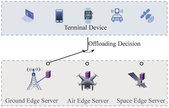In order to enlarge the coverage and improve the ability of edge computing, the terminal device can offload computation tasks to the space–air–ground integrated networking (SAGIN) [8,9]. From Figure 1, as one of the most promising network architectures, SAGIN is a heterogeneous network based on ground networks and supplemented by space and air networks. It mainly includes computation nodes such as ground servers, UAVs, and low Earth orbit (LEO) satellites. SAGIN is expected to provide full coverage and high-quality computing services for terminal devices. However, the movement of terminal devices and computation nodes, as well as the uncertainty of channels, make SAGIN a time-varying network. How to effectively manage the resources of time-varying network is a challenging issue. In addition, SAGIN has large requirement for the time complexity of resource management algorithm. Traditional optimization method for solving the resource optimization problem in time-varying networks often require decoupling the original problem and repeating the solving process, leading to the interruption or failure of some delay-sensitive tasks.
