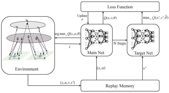 From Algorithm 2, the tack of deep Q-network is to exploit a feedforward neural network to approximate the Q-value function . To be specific, the input layer of this Q-network is the state s, as well as the output layer is action a according to state s. The loss function measures the distance between the trained model and the actual model. The general goal is to minimize the loss function and continuously optimize the model. Furthermore, the parameter attempts to minimize the loss function with the following equation.