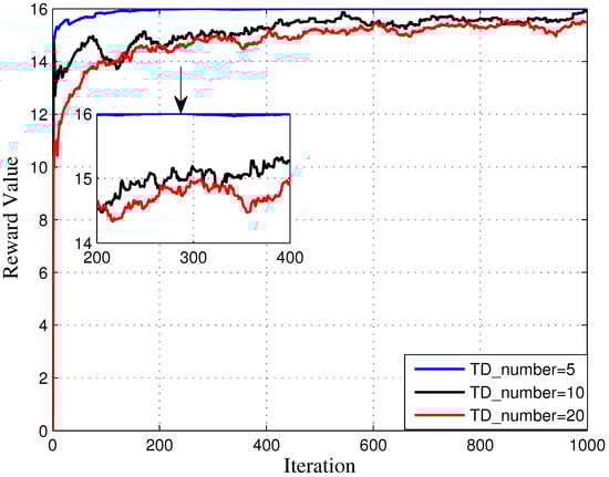 To verify the performance of DQN for computation offloading and resource management in SAGIN, different TD numbers are chosen. In this simulation, TD number is set as 5, 10, 20 in Figure 6, and it is obvious to obtain that the whole result curves can coverage to the optimal value finally. To be specific, with TD number increases, the reward value performs worse owing to the larger calculation quantity. At the case of , the reward value could achieve a stable solution after 400 iterations, while at the case of , the proposed approach is capable of achieving the optimal value at about iteration 100. To be concluded, with the increase in TD numbers, the signaling overhead raises apparently and the reward value of different TD numbers is affected subsequently.