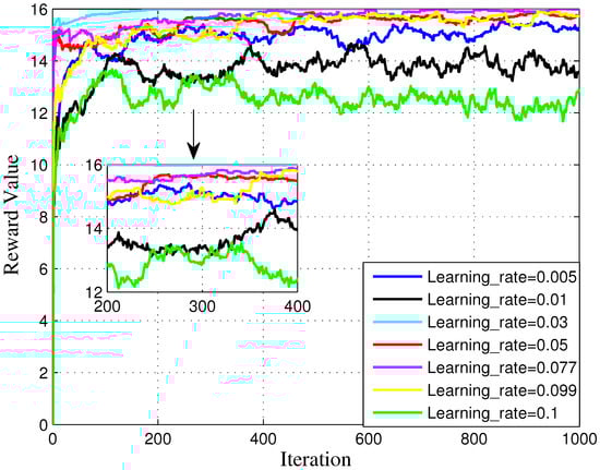 Figure 7 describes the impact on learning rate for DNN, which is set as 0.005, 0.01, 0.03, 0.05, 0.077, 0.099, 0.1. This figure demonstrates that learning rate has an important effect on the efficiency of the proposed approach. To be specific, in the case of , the reward value shown by DRL algorithm performs better than others during the whole iteration. is not capable of completing the curve like , but surpasses other cases. To be specific, has the worst performance among the different cases.