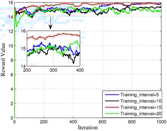 Figure 8 shows the reward value changes against iterations with different training intervals, while the value of training interval is determined as 5, 10, 15, 20. Obviously, we can obtain that while the training interval is 5 and 15, the reward value generated by DRL has a relatively better performance during the whole stage. In the case of , the reward value has a poor performance at the final stage.