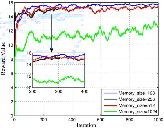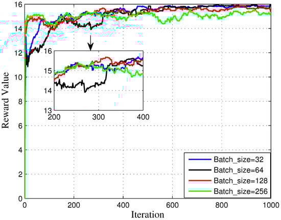 As displayed in Figure 9, the batch rate has an influence in the simulation result, which is set as 32, 64, 128, 256. In detail, when batch size equals to 32, it achieves the best performance after 400 iterations, even compared to 64, 128, and 256. The reward value of generated by DRL algorithm does not have a good performance at the first stage. Nevertheless, its reward value broadens swiftly and achieves a best performance when the iteration rate equals 1000. has a slightly worse performance than the case of . Additionally, does not performing well.