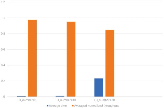 To address the system performance issues, we provide the simulation results about the average delay and average normalized throughput among different TD numbers which is set as 5, 10, 20. Additionally, the numerical results of average delay time are 0.005550882577896118, 0.011090971231460571, 0.23159347009658812, as well as average normalized throughput are 0.9762736113164308, 0.9512185884374253, 0.8488317945596101, respectively. From Figure 11, it can be achieved that when TD number equals to 20, the average delay time is largest and the average normalized throughput performs the worst. Through analysis, with the TD number increases, the whole transmission efficiency of this network system reduces correspondingly.