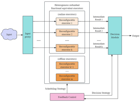 Motivated by the reliability theory and methods, one of implementations of the ESS theory is proposed, namely, the DHR architecture as shown in Figure 1, in which there are m functionally equivalent but heterogeneously implemented executors in total, and k executors among them are chosen to work at the same time (called online executors; this will lead to free executors, called offline executors). As shown in Figure 1, a traditional system can be considered a single executor system and the DHR architecture system is formed by its heterogeneous extension k times when working.