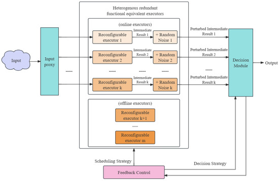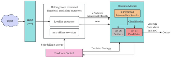 A key challenge of applying DP to the DHR architecture is making a decision upon perturbed intermediate results. Specifically, for the traditional DHR architecture (Figure 1), under normal system operating conditions (no attacks or failures happen), each online executor on a given input I outputs such that . In other words, the expected output of each online executor is consistent with the actual result in the normal system running. In this scenario, the decision module can easily make a verdict using the majority rule, and the expected system output also aligns with the actual one. On the other hand, if attacks or failures occur, the executors’ outputs and even the system output may be influenced. Concretely, the online executors are divided into two categories, the ‘attacked executors’ set A and the ‘normal executors’ set U: