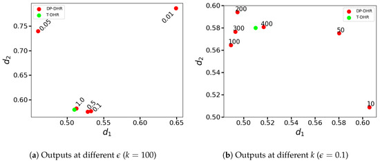 - : Due to the majority principle decision strategy, in the case of the traditional DHR architecture, the system’s output cannot be tampered with. This is because the intermediate results provided by the controlled executors are categorized as ‘attacked’, while the correct intermediate results are considered when making decisions. As a result, the integrity and the availability of traditional DHR do not decrease when ; however, the confidentiality (data privacy) is not protected. On the other hand, for the proposed DP-DHR framework, the theoretical and experimental results given above (Theorem 1 and Figure 6, Figure 7, Figure 8, Figure 9 and Figure 10) enhance the confidentiality (data privacy) without much sacrifice of the integrity and the availability.