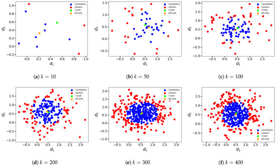 On the other hand, the candidates C should be close to the estimated output, and the outliers O should be far from the estimated output. For the p-dimensional output, the distribution of the candidates is a p-dimensional hypersphere around the evaluated expected output, and the distribution of the outliers is a p-dimensional hyperspherical shell outside the hypersphere. However, this classification requirement cannot be easily achieved by traditional clustering methods such as k-means [40] and its variants [41,42], spectral clustering [43], density-based clustering [44], (variational) auto-encoder (AE or VAE)-based clustering [45,46], graph-based clustering [47], etc.