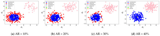 Regarding the adversary’s output , similar to Figure 6, we simulate the scenario where the adversary intends to mislead the system output, whether it is detected or not. In Figure 8, the light red point located at the top right corner (coordinates ) represents all the intermediate results generated by the attacked executors, as all the controlled intermediate results are mapped to this single point. Specifically, in Figure 8a–d, (40), (80), (120), and (160) intermediate results are respectively mapped to this point.