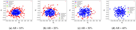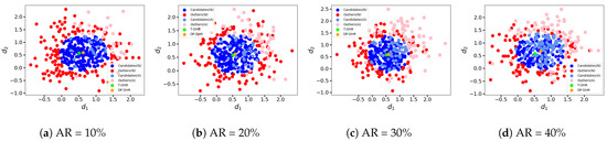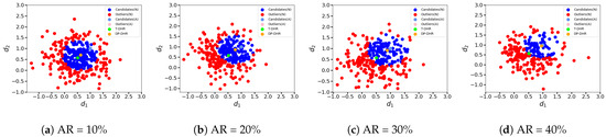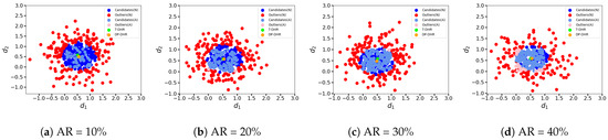As shown in Figure 10, the gap between the outputs given by the DP-DHR framework and the T-DHR architecture is larger compared to previous conditions. When comparing Figure 10a–d to Figure 9 (or Figure 8a–d), it is obvious that the gaps between the brown and green points are notably wider in Figure 10. Due to the relatively large distance between and the expected output , the output of the DP-DHR framework (the brown point) is ‘dragged’ away from the expected output of the T-DHR architecture (the green point) by the attacked executors. When AR is small, the consequence is not very pronounced. For example, in Figure 10a, when AR , although all the attacked results are classified as the candidates C, the gap between the DP-DHR output and the T-DHR output is not significant due to the small AR. On the contrary, when a large AR is employed as shown in Figure 10d, the attacked results would significantly mislead the output of the DP-DHR framework. In conclusion, it is evident that the gap between the DP-DHR framework and the T-DHR architecture becomes larger with the increase in AR as shown in Figure 10a–d. This observation aligns with common sense and the expectations.