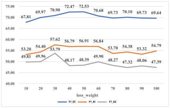 It can be seen from the line chart in Figure 4 that the F1 scores for event classification first increase from 71.9% to 72.5% with the value of the loss weight increasing from 10 to 20; then the F1 scores for event classification show a trend of declining when the loss weight continues to increase after peaking at 73.3%. For argument extraction, a loss weight of 60 gains the highest F1 scores for argument classification and argument identification. Before the value of the loss weight reaches 80, the trends between the F1 scores for all three tasks are roughly the same. When the value of loss weight is 90, our model performs well at event detection, but the F1 score for argument extraction is unsatisfactory. In contrast, the F1 scores for argument identification and classification increase greatly when the value of the loss weight increases to 100, while the performance for event classification declines. On the whole, 60 is a more appropriate value for the loss weight, at which our model can keep balance between event detection and argument extraction.