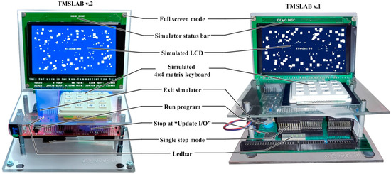 One of the microprocessor modules used in teaching classes is the TMSLAB system [53]. Its current, second version, is based on the Texas Instruments [56] TMS320F28379D MCU and is equipped with intermediate circuits enabling the use of a graphic-text LCD, a 4 × 4 matrix keyboard, and an LED line. The laboratory module evolved from the first version, equipped with the TMS320F2812 MCU system and a similar set of peripherals [41]. With a lot of effort, a system-level simulator [41] was introduced a few years ago for TMSLAB v.1 (Figure 1) and has been used since then in laboratory classes.