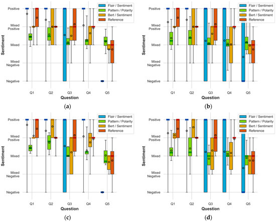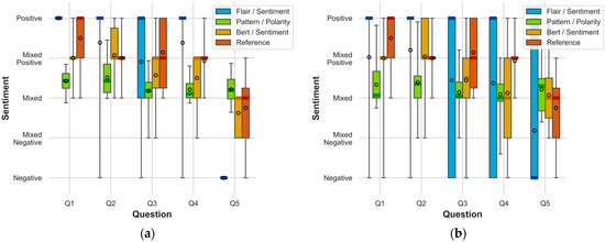 The presented results of the sentiment analysis have been divided according to the question number and presented in statistical terms with the median and average values separately for each of the analysis methods and reference responses that play a verification role. To better illustrate the collected data and their analysis, a broader statistical approach is presented individually for each question in the attachments in Figure A1, Figure A2, Figure A3, Figure A4, Figure A5, Figure A6, Figure A7, Figure A8, Figure A9, Figure A10, Figure A11, Figure A12, Figure A13, Figure A14, Figure A15 and Figure A16 for all study cases. There are both probability density distributions obtained for sentiment analysis methods and reference responses, as well as histograms that cover this issue as a supplement to the documentation of statistics regarding the obtained research results. The statistical results included in Appendix A to the article act as complete documentation of the survey results without the need to publish confidential results—another form of sharing survey results. They are also an intermediate element in determining the sentiment estimation error (1), the results of which are presented in Section 5.2.
