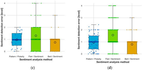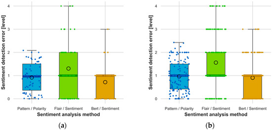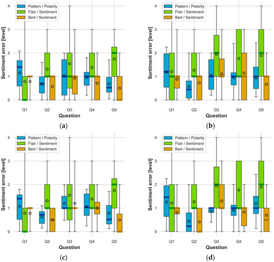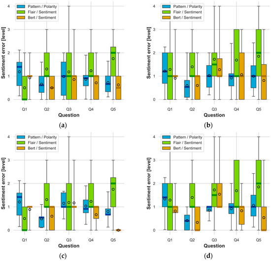 The obtained sentiment analysis results were related to the reference responses in accordance with Equation (1). On this basis, sentiment detection errors were determined and presented in Figure 5 and Figure 6 for all study variants.