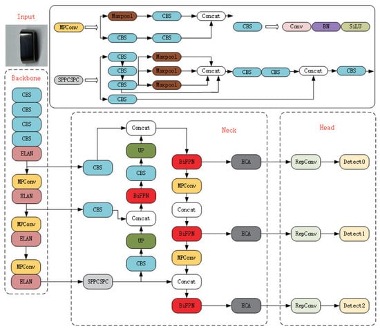 Therefore, our proposed method seeks to enhance the accuracy of detection and categorization of defects in automotive parts. In doing so, it confirms the effectiveness and reliability of our approach for boosting the performance of defect detection. The architecture of MBEA-YOLO is illustrated in Figure 1. In the figure, we can see that in the neck part we have added BIFPN and ECA attention mechanisms. In the model, four BIPFN modules are added to improve the feature fusion ability of the model, and an ECA attention mechanism is added to enhance the detection ability for small target defects. Finally, for the loss function part of the model, the original CIoU is replaced with Alpha-IoU, which can improve the robustness of the model. These changes to the model are described in detail later.