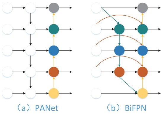 BiFPN enhances feature fusion at a higher level than PANet. It removes nodes with only one input edge (for example, the first node in Figure 2) because removing a node without feature fusion simplifies the network structure. In addition, it introduces additional edges that connect input and output nodes. This change not only simplifies the bidirectional network but also allows other features to be incorporated without significantly increasing computational costs. In BiFPN, each bidirectional path (top-down and bottom-up) is considered to be a layer of the feature network and is replicated multiple times to achieve high-level feature fusion, and BiFPN gives different weights to the features of different inputs so that the fusions of different input features are differentiated.