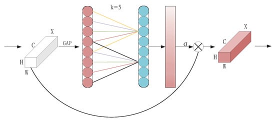 The ECA attention mechanism, representing an advancement over SENet, is illustrated in Figure 3. SENet reduces dimensionality to manage nonlinear cross-channel interactions and minimize model complexity. This method, however, affects channel attention prediction and is insufficient in capturing the full spectrum of inter-channel dependencies. In contrast, the ECA attention module circumvents dimensionality reduction and employs one-dimensional convolution to effectively facilitate local cross-channel interactions. This process extracts the dependencies between channels, thereby efficiently capturing their interactions. When a neck module with an ECA attention mechanism is added, the defect features input into this module are convolution in one dimension so as to realize the interdependence of features of different auto parts and to cause effective interaction with context features, which can effectively enhance the recognition ability for objects with different sizes. The simplicity of the ECA mechanism in both concept and execution minimally affects the processing speed of the network, guaranteeing accuracy and efficiency when detecting automotive parts.