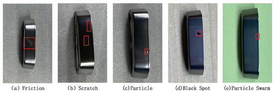 The dataset utilized in this study consists of a custom collection focused on the interior button trim rings of BYD vehicles, which are made from PC+ABS material. This dataset comprises several defect types: friction, scratch, particle, black spot, and particle swarm, with 240 images for each category. The details of these defect types and features are illustrated in Figure 5. The dataset is divided into training, validation, and test sets with a ratio of 10:1:1. To assess whether the experimental improvements can be applied to other types of defect detection, we also utilize the NEU-DUT dataset from Northeastern University for comparative analysis.