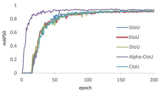In Experiment 5, the adoption of Alpha-CIoU led to a 4.4% increase in and slight improvements in detection accuracy and recall rates of 0.3% and 1.7%, respectively. In addition, the integration of three bounding box regression methods—DIoU [26], GIoU [27], and EIoU [28]—was introduced. The experiment consisted of 200 iteration rounds, with the mAP50 comparison represented in Figure 9.