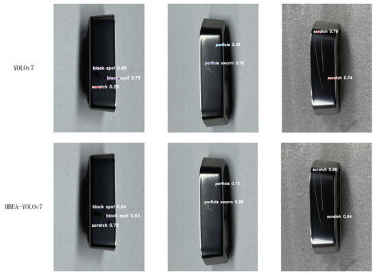 To visualize the effect of the enhanced model on defect detection, this study analyzed the test set with both the original and the enhanced models. The comparison between YOLOv7 and the upgraded MBEA-YOLOv7 in some image tests is presented in Figure 10. This comparison aims to clearly demonstrate the enhancements the enhanced model introduces for detecting target defects.