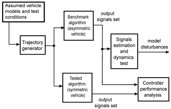 A scheme of the procedure for evaluating the usefulness of control algorithms for asymmetric vehicles in horizontal motion proposed in this article is shown in Figure 2. This method is performed in several stages:
