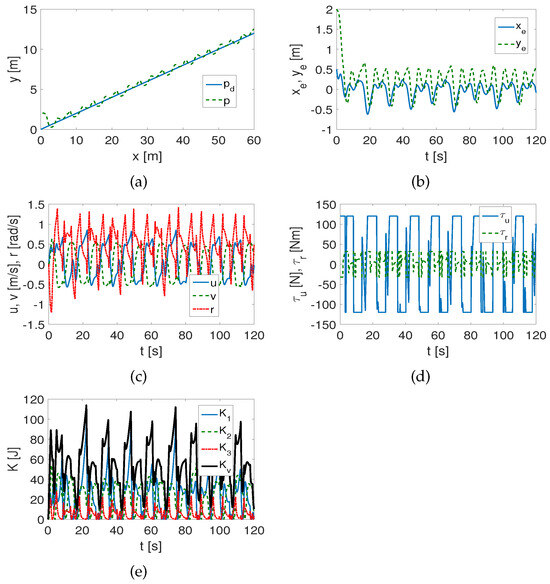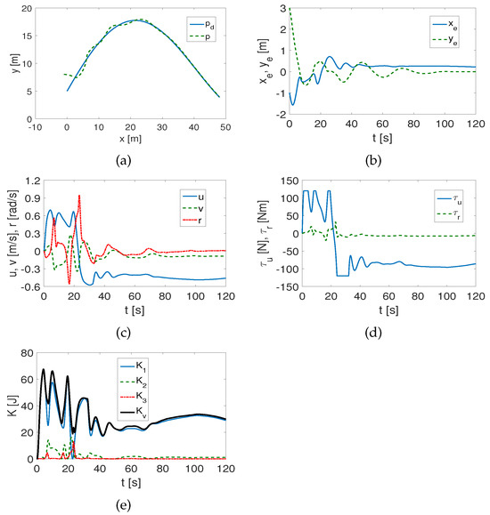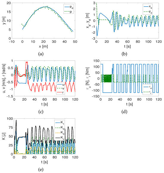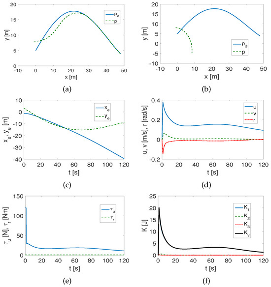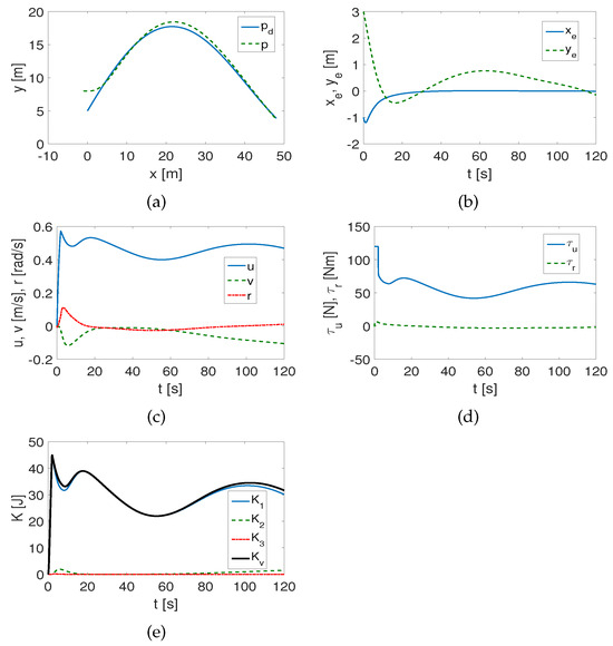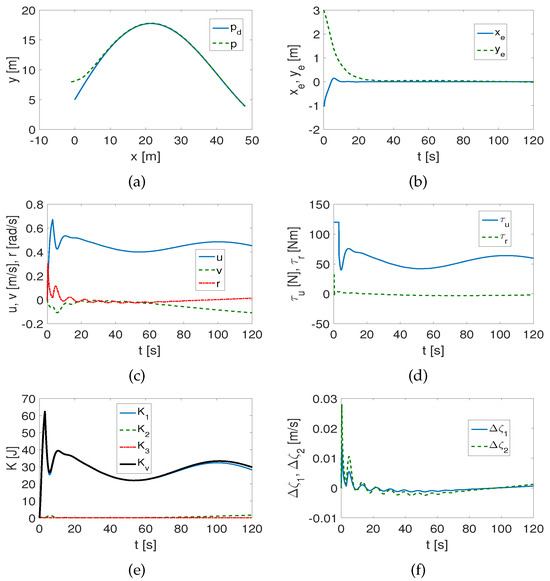 One solution to ensure that the possibility of shifting the center of mass is taken into account is to assume partial asymmetry of the vehicle model (symmetry in the longitudinal axis). For such a formulated task, there are many solutions, only some of which will be referred to here. Control strategy designs confirmed by simulation tests can be found, for example, in [32,33,34,35,36,37]. There are studies in which control methods have been tested experimentally. In [38], a linearization method was applied using the hand position point as input, and, based on this, a trajectory tracking strategy was developed. However, it was assumed that the ocean current in the inertial system was constant and non-rotational, which limits the applicability of this strategy. An approach combining NN and the error transformation function to guarantee transient tracking performance was described in [39]. In this case, the disturbance was variable. An adaptive sliding mode control was verified experimentally in [40], whereas an adaptive integral terminal super-twisting algorithm was designed for guidance and control according to a cascade strategy in [41]. In both papers, it was assumed that the off-diagonal terms of the inertial matrices were small compared to the main diagonal terms and could, therefore, be neglected. The method proposed in [42] was based on a model transformation that allowed the derivation of control models for the radius-track, yaw-track and sway-track in a newly defined polar coordinate system moving along a path (PMPCS). If the control method has been experimentally verified, it can be concluded that it guarantees satisfactory performance of the controller (with the introduced limitations and assumptions) and its usefulness is obvious. Also, when the model is partially asymmetric, additional components are often introduced into the controller to ensure robustness to changes in model parameters and environmental factors. But when the verification involves simulation only, then there is no such guarantee. This paper refers to works utilizing simulation validation.