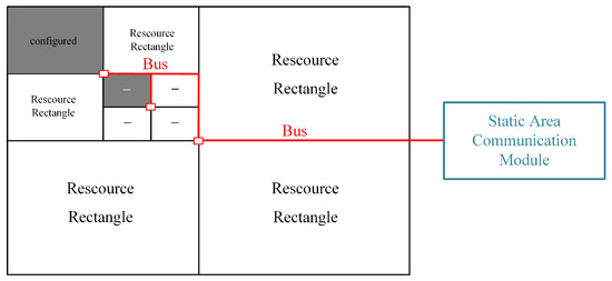 (3) Biggest Resource Area (BRA): It represents the largest available free resource rectangle on the FPGA chip, i.e., the maximum resource request that the FPGA chip can respond to. For quadtree resource management, the BRA is shown in area A in Figure 9a. For centralized bus resource management, the BRA is shown in area C in Figure 9b.