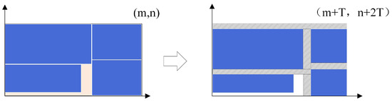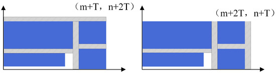 The arrangement E d g e B I T = { E 1 , E 2 , E 3 , } of all sides is constructed when the combination of the adjacent sides is performed. If the adjacent edges correspond to different rectangles and are both horizontal or vertical, a new combined rectangle is generated. If the number of elements in S B I T is n and the number of newly generated rectangles is N N E W , then N N E W satisfies N N E W 2 n 1 . A combination of the two edges that satisfy E i < E j produces a new rectangle whose side length can be expressed as Formulation (4).