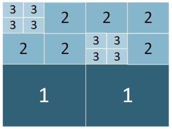 By taking the logarithm of the total resources with a base of 4, resource requests are graded, which is more in line with the quadtree resource management approach and also convenient for computation.The “level-resource amount” table is created with the level as the subscript, and the number of resources contained in the node of the current level is stored. As shown in Figure 7, the entire reconfigurable partition is treated as a level 0 resource, and the resource level is incremented by one each time. When the quadtree is in its initial state, the number of level 0 resources is 1, and the number of other equivalent resources is 0. Instead of maintaining the quadtree structure, use the resource node amount maintenance method. A container whose size is the total number of levels is a “level-node amount” table; the table entry stores the amount of resources corresponding to the current resource level and the number of remaining nodes. When a subtask requests a resource, it can obtain a level suitable for its own needs and request resources by checking the level-node amount table.