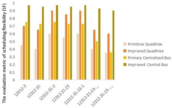 The changes in the scheduling flexibility of the application release sequence are shown in Figure 10. According to the results of the second set of experiments, it can be seen that the random application and release of resources changes the numerical relationship between the centralised bus algorithm and the quadtree algorithm. Figure 10 shows the reusability of the generation layout by the quadtree resource management algorithm. Since the task combination algorithm can change the rectangular shape of the application resource to adapt to the resource layout at different times, there is greater flexibility in managing non-empty devices than the original resource management algorithm, as the resource flexibility of the two improved algorithms is always higher than the two original algorithms. The quadtree algorithm is a resource management algorithm with fixed resource shape and size. Multiple tasks in the task sequence share the same task space, and the freed resources are more easily used by subsequent tasks, as shown in Figure 10 by the decreasing gap between the two quadtree algorithms and the original centralised bus algorithm.