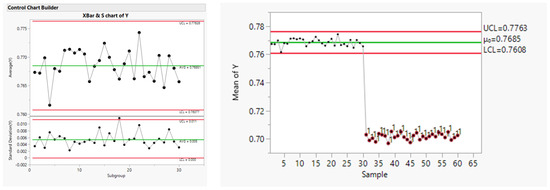 Control charts of cycle time (left) for 30 and another 30 (right) consecutive observations (JMP 17.0).