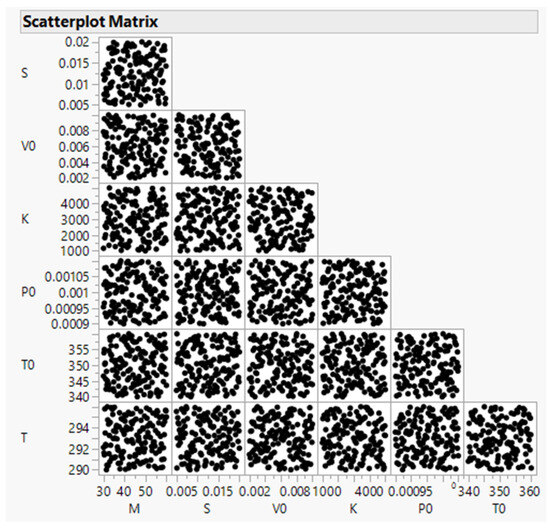 To better understand the behaviour of the piston and provide diagnostic information, we run a space-filling Latin hypercube design consisting of 150 experimental runs. For more information on such space-filling designs, see [8,12]. Figure 2 shows the experimental array with two-way scatterplots.