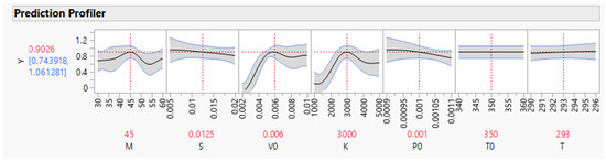 For these experiments, we fit a Gaussian process. Figure 3 shows the process parameters, and Figure 4 shows the profiler and the marginal effects of the seven factors on the piston cycle time. We can see that changes in V0 and K have an effect on cycle time. Figure 3 indicates the total sensitivity for V0 and K to be 0.49 and 0.30, respectively. This confirms that K and V0 have high leverage on cycle time. This emulator model can now be used to investigate what-if scenarios and help troubleshoot investigations. Incorporating such a model in a digital twin of an operating piston provides enhanced monitoring and diagnostic capabilities. For more information on the properties of the piston simulator, see [7,8].