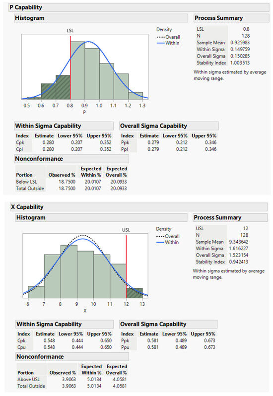 This yields for P a defect rate of 0%, with a mean of 1.26 and a standard deviation of 0.076, and, for X, a defect rate of 9.7%, with a mean of 11.16 and a standard deviation of 0.748.
