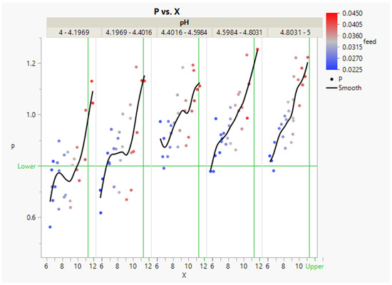 P versus X scatterplots in various pH categories. The colour of points indicates the level of feed (JMP 17.0).
