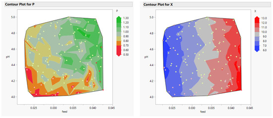 Contour plots of pH versus feed, for P (left) and X (right), with observations used to fit the Gaussian model marked as dots (JMP 17.0).