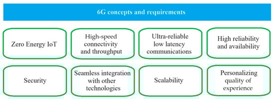 To sum up, the 5G networks currently in use will not satisfy the requirements expected to be necessary for operation from 2030 onward in terms of delays, throughput, and traffic density [23]. Currently, much research is being carried out on both the physical layer and higher layers of the International Organization for Standardization/Open Systems Interconnection (ISO/OSI) model, the results of which are intended to provide 6G networks with higher performance and the ability to implement new functions in M2M connections, thanks to global coverage, very low delays, high reliability, mass connectivity, improved intelligence and security, non-orthogonal multiple access, MIMO, energy harvesting, hybrid terrestrial and satellite relays, improved IIoT-based automation, millimeter wave band utilization, interference management, hybrid precoding, and statistical shaping beams [24]. Additional requirements for 6G networks are imposed by the sources of industrial data (including medical data, as in the case of the Internet of Medical Things—IoMT) and, on the other hand, by the methods of their use: mass processing, analysis, classification, inference, and prediction from data, including for the purposes of automation, computerization, and technical control as well as analysis of the life cycle of products and carbon footprint of processes [25,26,27].
