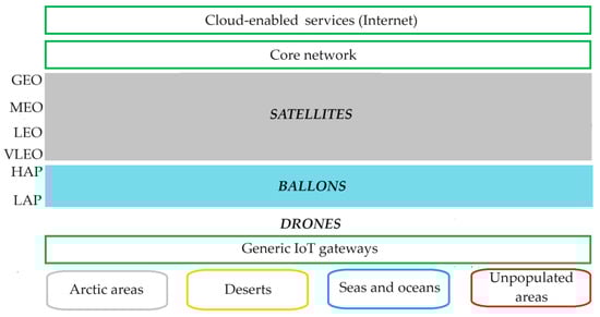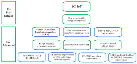 The Internet of Remote Things (IoRT) provides the opportunity to expand the Internet of Things, producing and providing services in remote and geographically isolated areas where traditional Internet connectivity is a challenge. Non-terrestrial networks (NTNs) are a solution that enables the integration of satellites and UAVs with cellular networks. The 3GPP activities have addressed the problem of standardizing the NTN network to provide an energy-efficient IoRT environment in 6G networks (Figure 2, Figure 3, Figure 4 and Figure 5) [7].