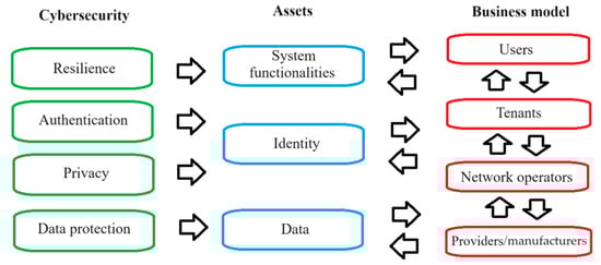 The areas of industrial application of 6G-based IoT include IIoT as well as the Internet of Vehicles (IoV) and Internet of Drones (IoD), offering intelligent communication between a huge number of objects around us, including M2M communication. This requires smooth data flow, uninterrupted communication capabilities, low latencies, and high reliability, based on a network of access points (APs) serving user nodes. Resource control is handled through pilot-based AP selection (PBAS). The PBAS algorithm improves spectral efficiency by 22% at the cell edge and 1.5% at the cell center [13]. Industrial activity also includes the management of vehicle fleets. Vehicle social networks (VSNs), a component of vehicle-to-everything (V2X) services, enable vehicles to create social networks on roads and in garages or warehouses to improve passenger comfort and safety and raise confidence in the transportation of goods and services. Their requirements include lower latency, higher connection density, and up to 100% coverage. Blockchain-based collaborative distributed intrusion detection (BCDID) and dynamic bandwidth throttling (DTS) prevent attacks in VSN networks (involving taking over one of the network devices) [14]. Ensuring high-speed communication between multiple applications and multiple interactive services simultaneously requires a stable propagation environment without connection drops, data loss, or high latency. Distributed IRSs increase the reliability of 6G transmission but cause increased overhead resulting from the use of multiple IRSs, which requires effective resource control (linking IRS sets to the user’s equipment, based on the intelligent-reflecting surface-user equipment association based on pilots (IUABP) algorithm, for example). In tests, this resulted in a 30% improvement in the total transmission speed [15]. The error propagation and computational complexity of signal detection in multi-input, multi-output wireless orthogonal frequency division multiplexing (MIMO-OFDM) systems require the development of simpler and efficient iterative feedback signal detection. This can be implemented, for example, by optimizing the feedback point of the minimum mean squared error ordered successive elimination constellation (MMSE-OSIC), which provides an approximation of optimal detection. The vector closest to the received signals is selected based on the maximum likelihood criterion, improving the correctness of the decision in subsequent iterations. For fast operation, however, it requires a reasonable selection of initial parameters (such as the relaxation coefficient) and parallel coarse and fine detection [16]. Sixth-generation network security is also important from an economic perspective—identifying business relationships and business-oriented security analysis by qualitatively assessing the impact of individual security breaches under different business conditions. This means that one can model the effects of security attacks in individual scenarios and their impact on the dynamics of a specific type of business (for instance, a product or service market segment; Figure 7) [17].