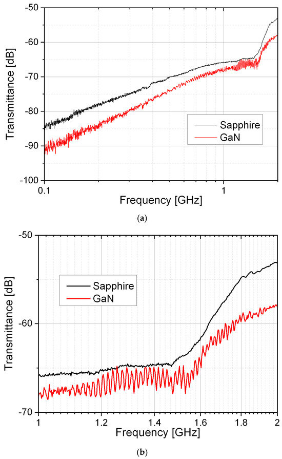 In Figure 3a, a monotonic increase in transmittance values from −93 to −57 dB can be observed for a structure with dt = 200 μm. The measured characteristic waveform shape is caused by the capacitive interactions, as suggested by the exact same shape for structures fabricated on the clear sapphire substrate. Particularly interesting is the presence of saw-like oscillations in higher frequencies. They are only present for test structures with piezoelectric layers. The main difference between the measured test devices appears at frequencies above 1 GHz. For structures made in the AlGaN/GaN heterostructure, oscillations can be observed (Figure 3b). As these do not occur for structures fabricated on sapphire, it can be assumed that they are the result of piezoelectric interactions. In addition, they have the character of interference between electrical and acoustic interactions, considering that the observed oscillations vary in amplitude with small changes in frequency, which is a result of successive resonances of the propagated acoustic wave with a specific phase velocity. The whole transmission characteristic can be described as a combination of a capacitive component (constant phase shift) and an acoustic component with variable phase. To determine the phase velocity of the acoustic wave propagation, the phase variation of the wave as a function of the distance between the electrodes has to be analyzed. The propagation of an acoustic wave on the surface between the electrodes can be described by the dependence [18] (1), as follows:
