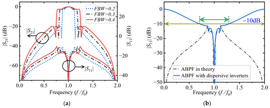 Frequency response of the quasi-elliptic ABPF. (a) Frequency response of the quasi-elliptic ABPF under different FBWs; (b) effect of the dispersive inverter on the reflectionless response.