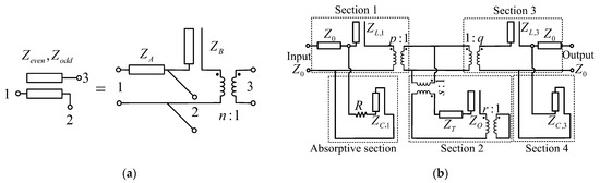 Based on the analysis above, an equivalent impedance transformer model of the ABPF circuit in Figure 2 is derived, as shown in Figure 4b. Firstly, two transmission lines with a characteristic impedance of Z0 are inserted at the input and output ports to match the source and load without altering the frequency response of the filter. Secondly, the positions of the quarter-wavelength transmission line and open circuit stub in Section 2 are exchanged using Kuroda’s identity without changing the input impedance of the overall parallel section [29]. Then, the impedances of the quarter-wavelength transmission line and the open circuit stub are transformed into