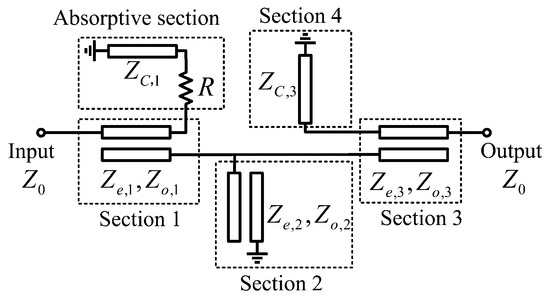 Based on the equivalent impedance transformer model in Figure 4b, a coupled-line-based quasi-elliptic ABPF scheme is devised that avoids the adoption of dispersive transmission line inverters, as illustrated in Figure 5.