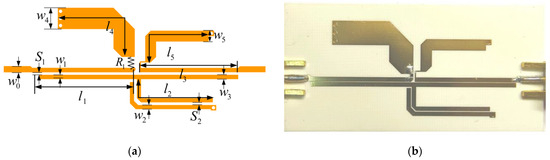 Equation (14) requires that the parameter value of be equal to . In summary, based on the parameter values in Table 1 and Equations (6)–(15), a coupled-line-based quasi-elliptic ABPF can be fulfilled, which not only eliminates the restriction to reflectionless bandwidth caused by conventional dispersive transmission-line inverters but also achieves a compact size.