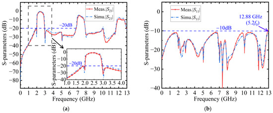 Simulated and measured S-parameter of the proposed ABPF. (a) S21; (b) S11.