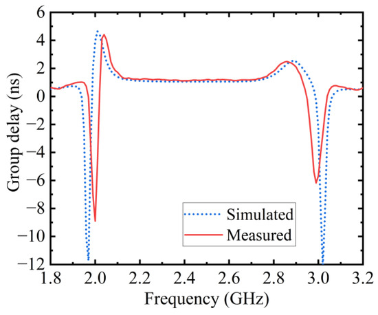The fabricated ABPF prototype was measured using an Agilent E8363C vector network analyzer. Figure 7 shows the measured and simulated S-parameters. Within the pre-specified passband range of 2.08 GHz to 2.82 GHz, the minimum and maximum in-band insertion losses were 0.83 dB and 3.89 dB, respectively. The measured 3 dB passband was from 2.09 GHz to 2.81 GHz. The return loss was better than 10 dB from DC to 12.88 GHz, which is commonly viewed as the reflectionless range. Two TZs near the passband were located at 1.99 GHz and 3.01 GHz. Both the upper and lower stopband suppression were larger than 20 dB, and the upper stopband was up to 6.80 GHz. The upper and lower out-of-band roll-off rates were 93.9 dBc/GHz and 121.4 dBc/GHz (attenuation: 20 dB at 2.0 GHz and 2.94 GHz), respectively. It can be observed that the measured passband bandwidth was slightly smaller than the simulated one. The main reason for this difference is that the gap spacing S2 between the coupled lines of the fabricated filter prototype is slightly larger than the design value, which is caused by the limitation of PCB processing accuracy. In addition to the S-parameter, the measured group delay is also illustrated in Figure 8. Within the 3 dB passband, the measured minimum and maximum group delay values were 1.12 ns and 1.38 ns, respectively, which indicate a good phase response.