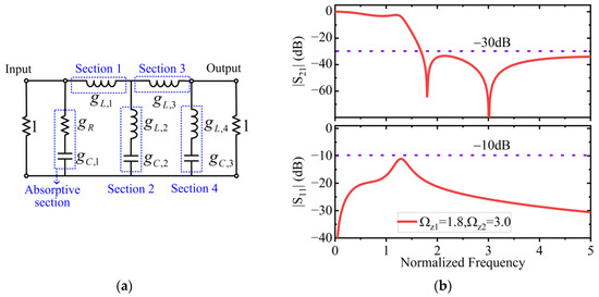 Figure 9b illustrates the transmission response of the high-order ALPF prototype shown in Figure 9a. As can be seen, through a combination of the two TZs at ΩZ = 1.8 and ΩZ = 3.0, an out-of-band rejection level higher than 30 dB is achieved. At the same time, a low reflection response with return losses of better than 10 dB is also realized over all normalized frequencies. In accordance with the design methodology proposed in this paper, a high-order coupled-line-based quasi-elliptic ABPF with two pairs of TZs can be designed based on the ALPF prototype shown in Figure 9a.